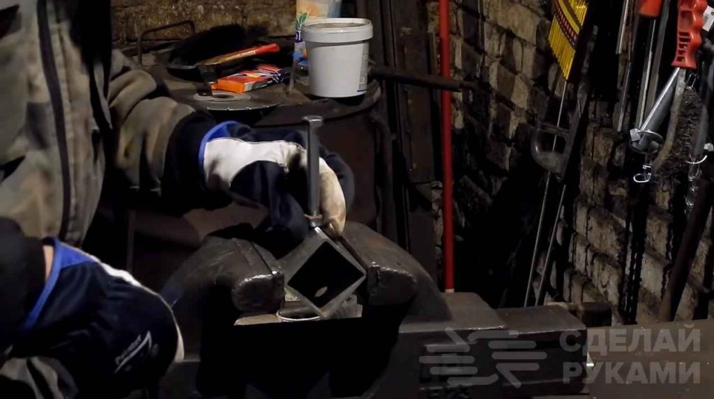 Затем нужно будет отрезать небольшой кусок профильной трубы квадратного сечения, после чего просверлить в нем отверстие (в ребре профиля). К этому отверстию потом приваривается гайка, в которую вставляется длинный болт.