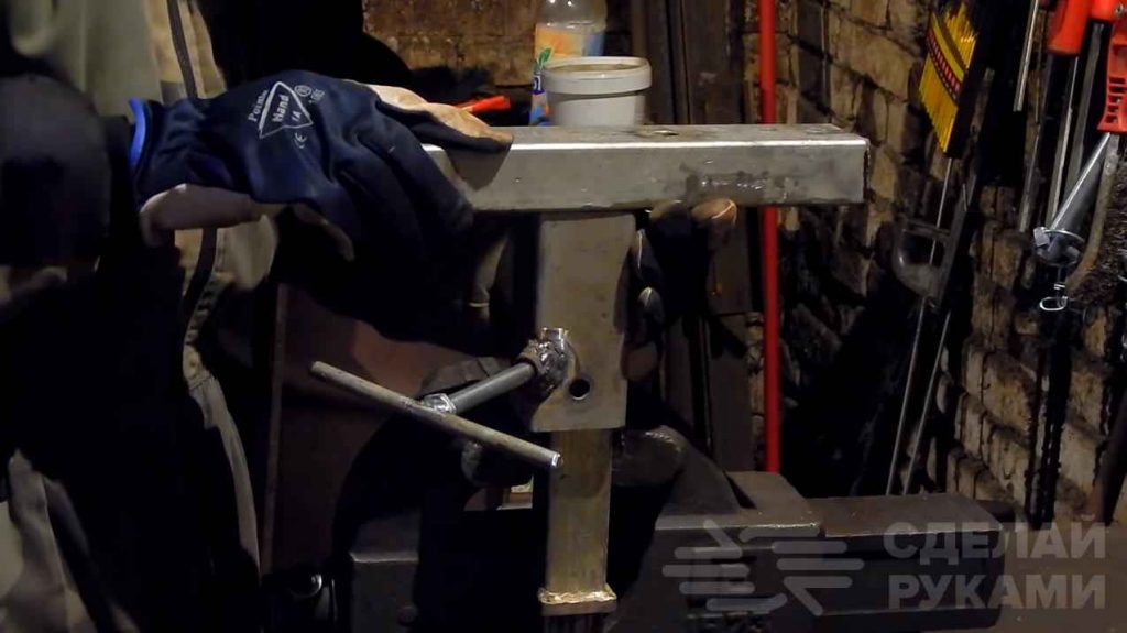 К верхней части болта (к шляпке) приваривается кусок стального круглого прутка. В итоге должен получиться вороток. Затем мастер отрезает еще два куска профиля, и сваривает из этих заготовок цельную конструкцию.