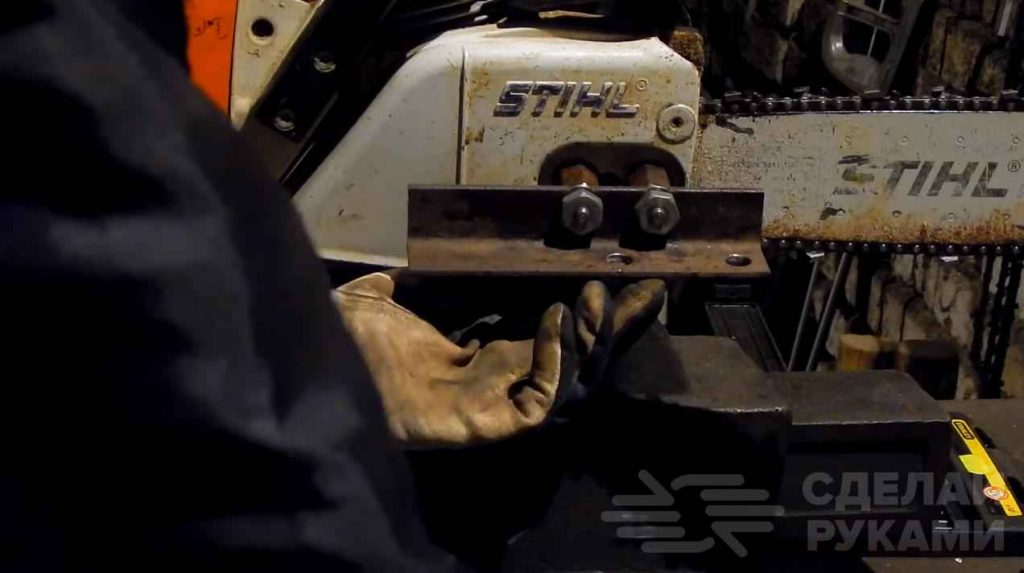 На последнем этапе работ выполняется сборка приспособления и покраска (по желанию). Процесс изготовления универсального крепления для фиксации бензопилы своими руками рекомендуем посмотреть в видеоролике на сайте.