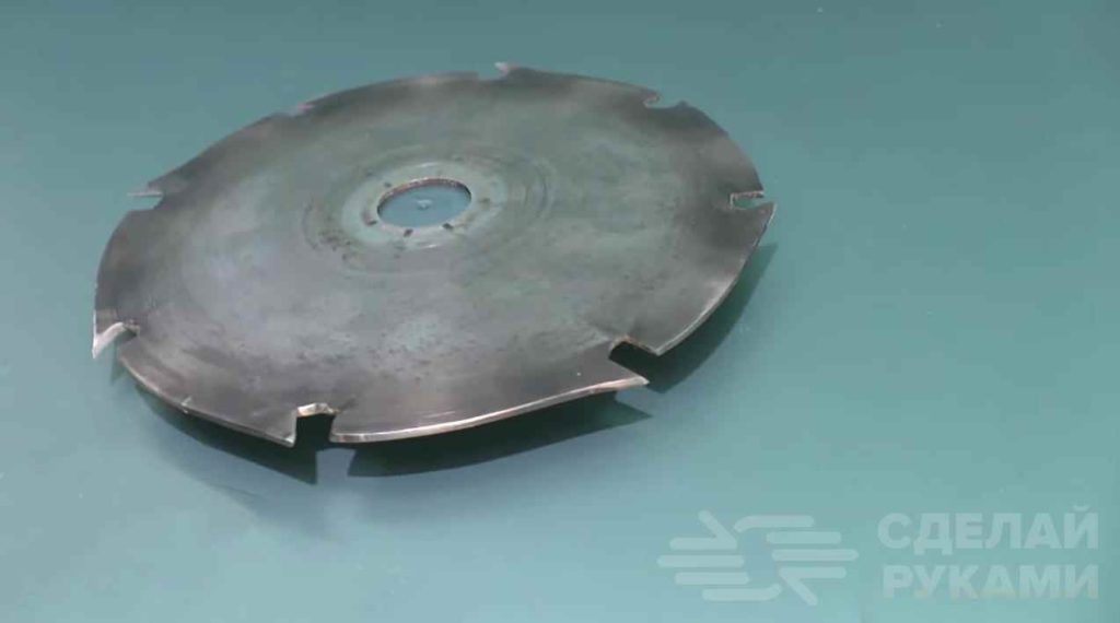 Весь секрет высокой производительности самодельного диска заключается в форме и количестве режущих зубьев. Во многом именно благодаря специальной форме зуба диск не зарывается в древесину, а также не теряет обороты даже на слабом триммере.