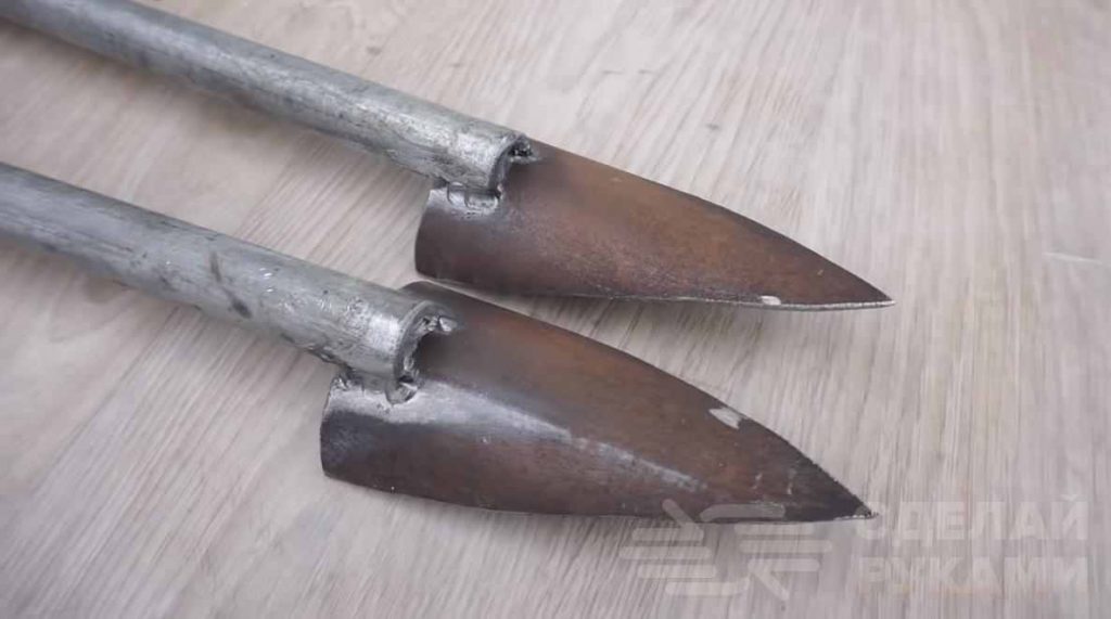 Далее отрезаем два куска трубы, которые будут использоваться в качестве ручек, и привариваем получившиеся «лопатки».
