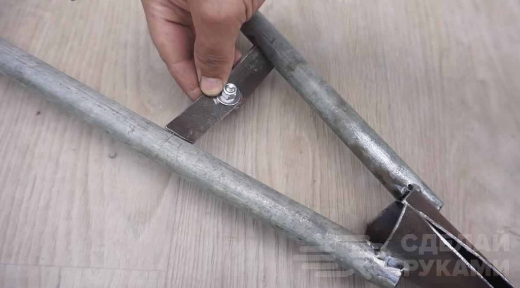 На следующем этапе отрезаем две пластинки, сверлим в них по одному отверстию, и соединяем болтом с гайкой. Потом эти пластинки привариваем к ручкам.