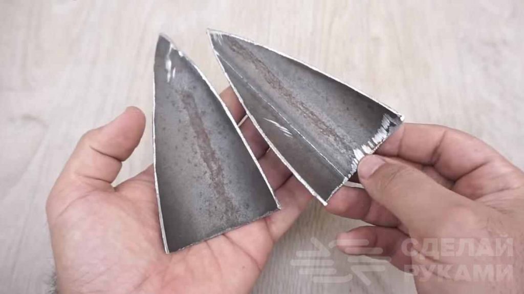 Первым делом необходимо будет вырезать из круглой трубы две заготовки треугольной формы («лопатки»). Сначала автор делает разметку, вырезает на конце трубы клинья, и потом отрезает уже сами заготовки.