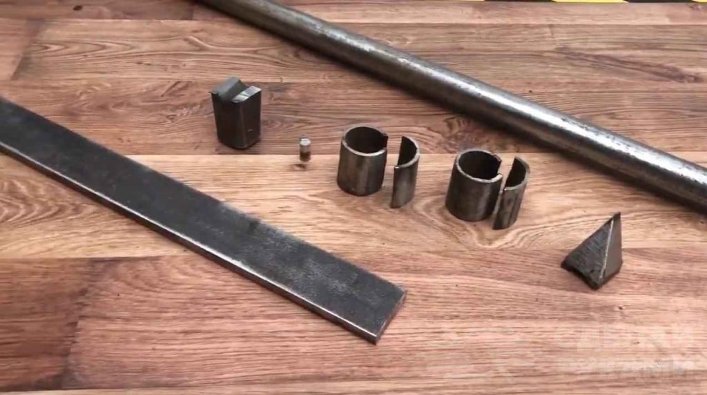 Из основных материалов для изготовления самодельной «треноги» (или стойки) потребуется два отрезка стальной трубы, металлический прут, старый молоток, полоса металла шириной 40 мм.