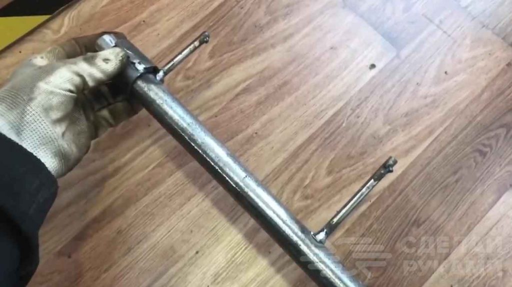 Один из отрезков трубы длиной 40 мм нужно разрезать на две части вдоль. А в двух оставшихся отрезках трубы нужно будет сделать небольшие прорези под диаметр стального прутка.