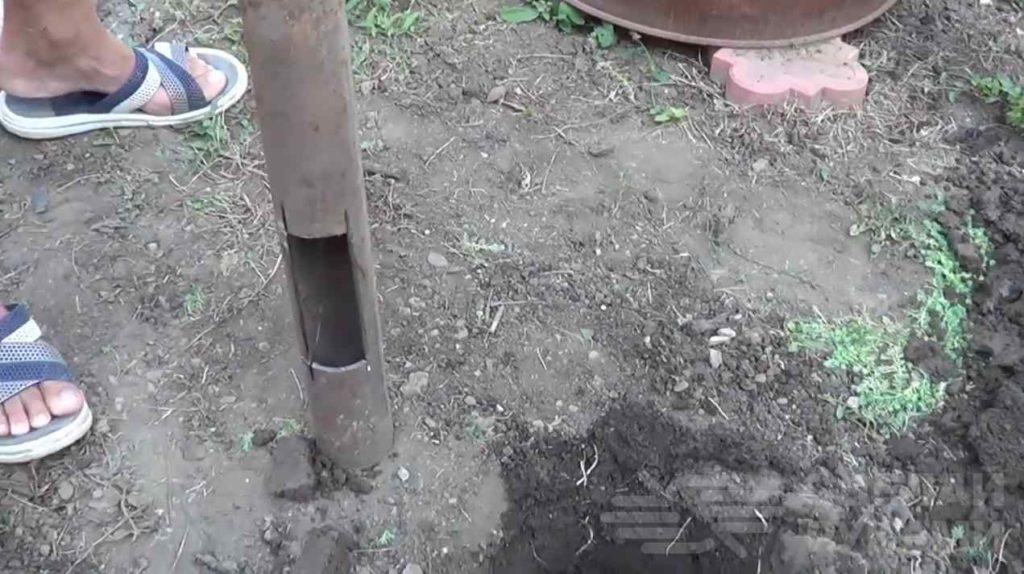 Первым делом определяем место, где должен будет стоять столб. При помощи самодельного или покупного ручного бура делаем в грунте лунку нужного диаметра и подходящей глубины.