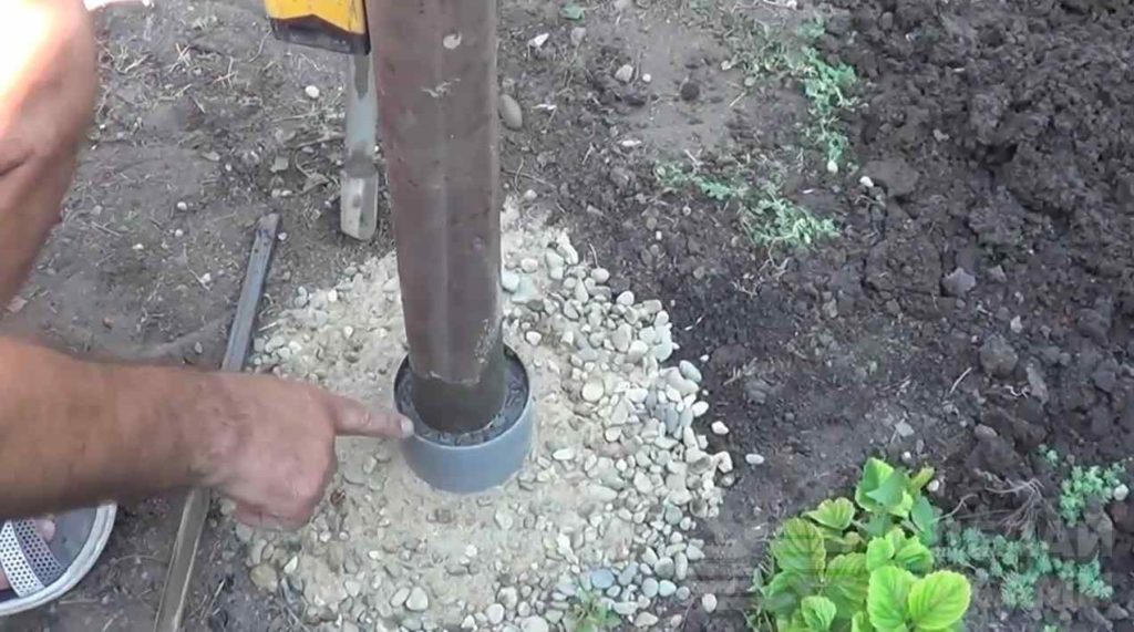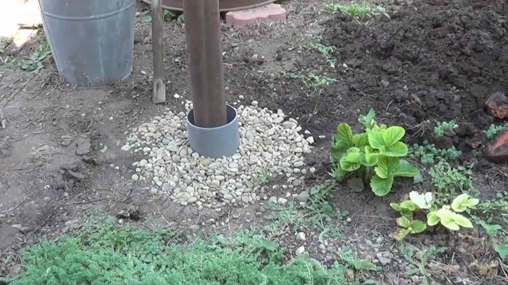 Затем на металлическую трубу автор надевает кусок ПВХ трубы, немного утапливая ее в бетон. Верхний край трубы должен быть выше уровня земли на 8-10 см.