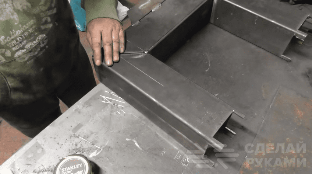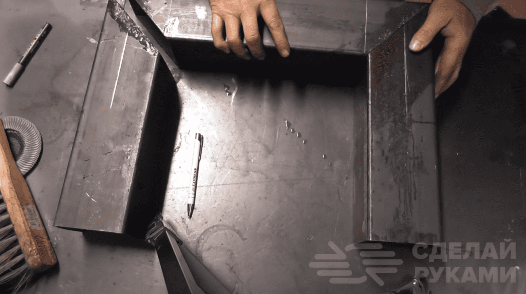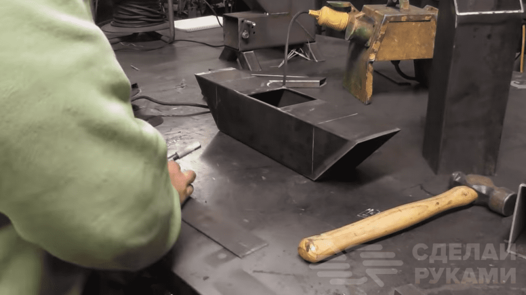 Затем вокруг квадратного отверстия в профиле привариваем четыре «стенки» для фиксации основной «выхлопной» трубы ракетной печи. На следующем этапе нужно приварить также два дымохода по бокам.