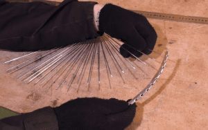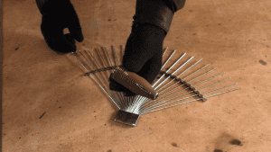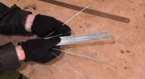 От спиц отделяются головки чтобы получить ровные стрежни, с одного конца они зажимаются в расплющенный кусок трубы диаметром 25мм. Зажаты спицы должны быть в одной плоскости, после чего их необходимо раздвинуть на равные расстояния друг от друга.