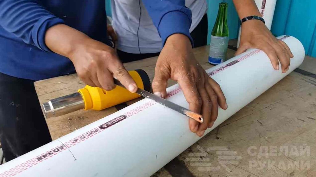 Первым делом необходимо отрезать кусок ПВХ трубы подходящей длины — зависит от того, какой высоты грядку вы хотите сделать. При помощи ножовки по металлу нужно сделать прорези (на равном расстоянии друг от друга).