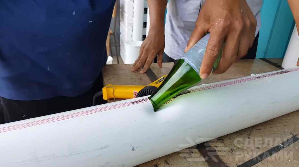 Далее прогреваем участки с прорезями строительным феном, и затем с помощью стеклянной бутылки делаем «карманы».