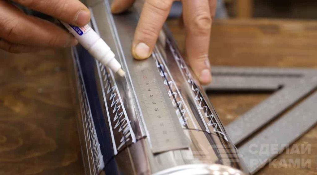 Первым делом автор делает разметку на трубе. С помощью болгарки надо вырезать куски треугольной формы. Края реза обрабатываем напильником.