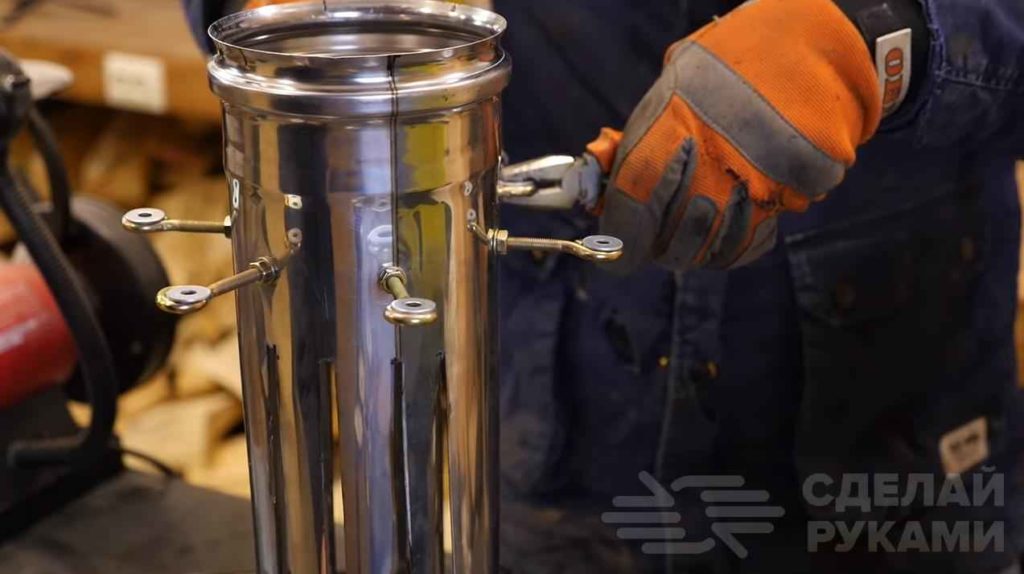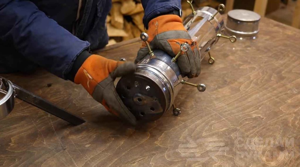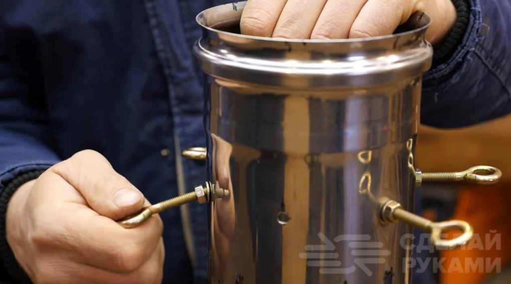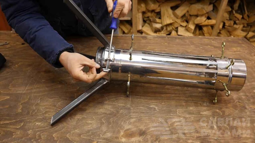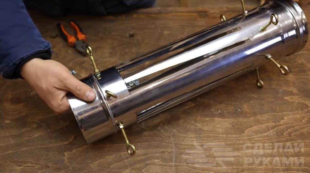 В нижнюю часть трубы вставляем заглушку с отверстиями, а потом надеваем на трубу хомут с ножками и затягиваем его.