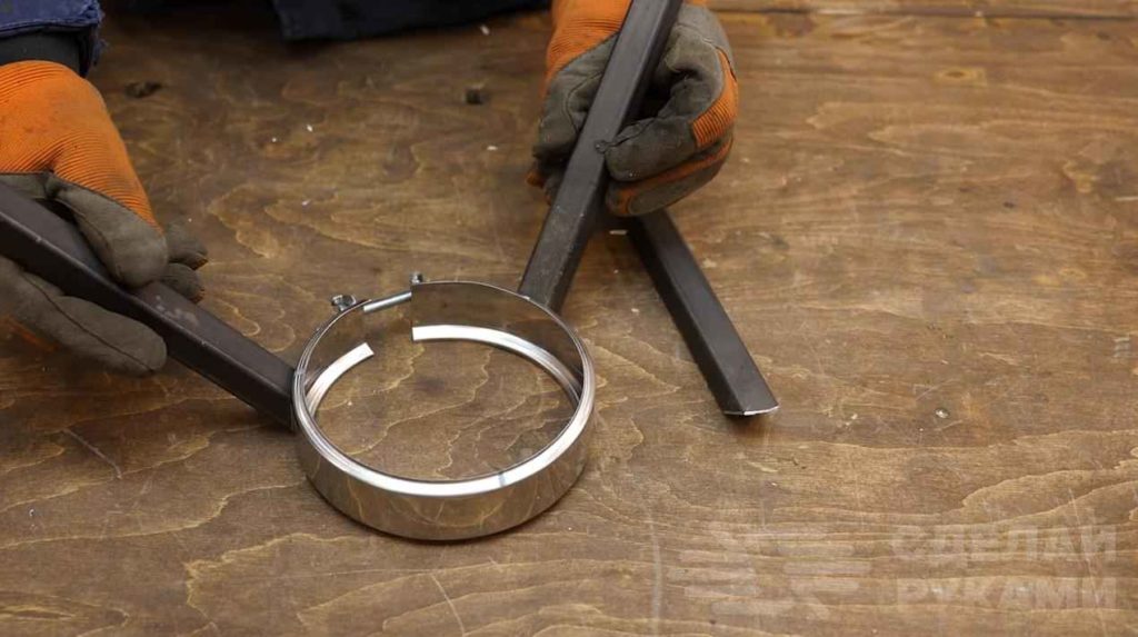 Далее берем заглушку и сверлим в ней отверстия. К хомуту для труб необходимо будет приварить три ножки, которые можно сделать из профильной трубы.