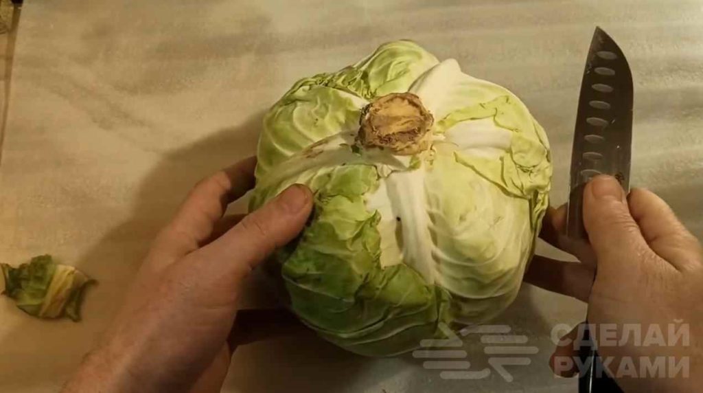 Первым делом необходимо выбрать подходящую по размеру белокочанную капусту и отрезать от нее нужное количество листов.