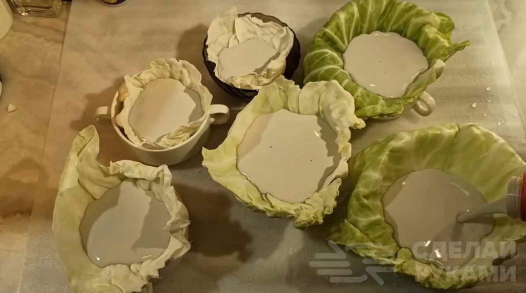 На следующем этапе заливаем гипсовый раствор в капустные листы. После заливки каждую форму слегка нужно провибрировать рукой, чтобы гипс заполнил все пустоты.