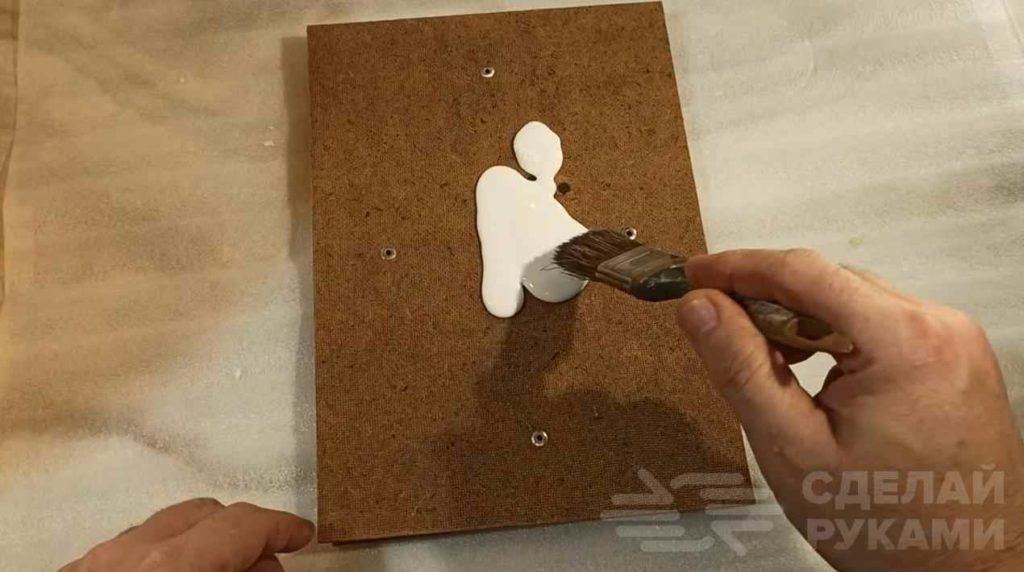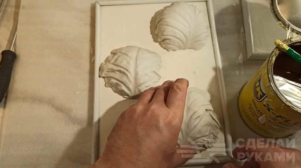 Далее из кусков ДВП и деревянных планок делаем рамки. Основание нужно предварительно покрасить в белый цвет. Затем приклеиваем к ДВП детали из гипса.