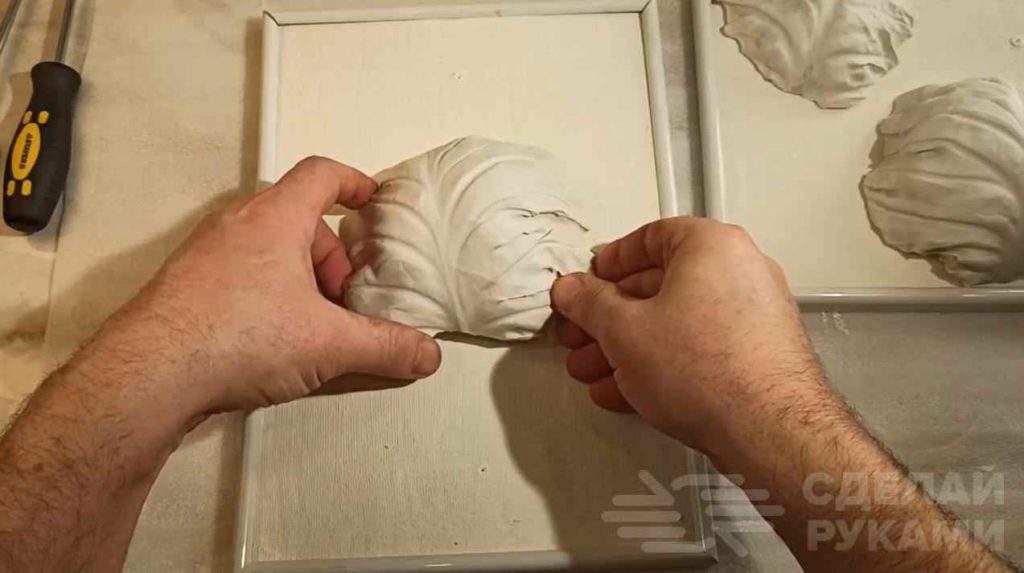 Можно приклеивать как по одной, так и по несколько таких деталей. После этого рамки с готовыми барельефами крепим к стене.