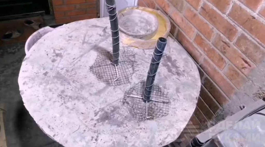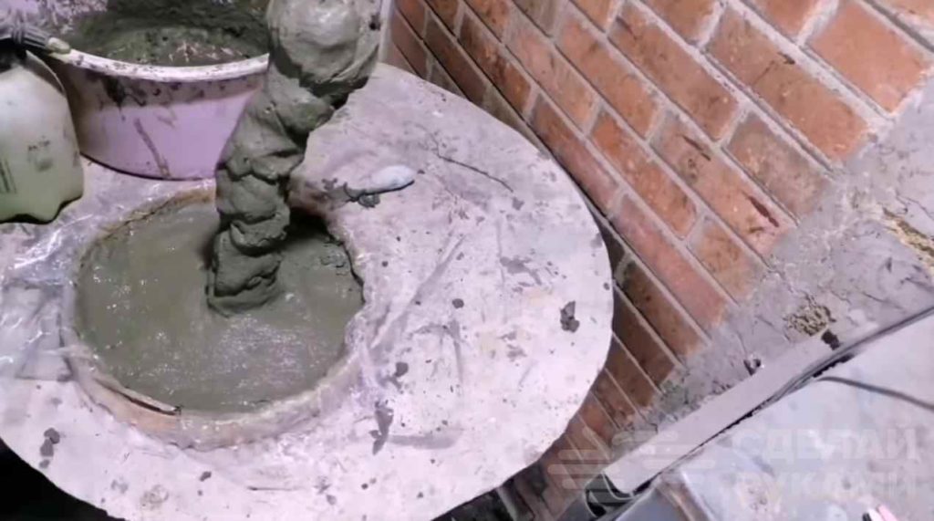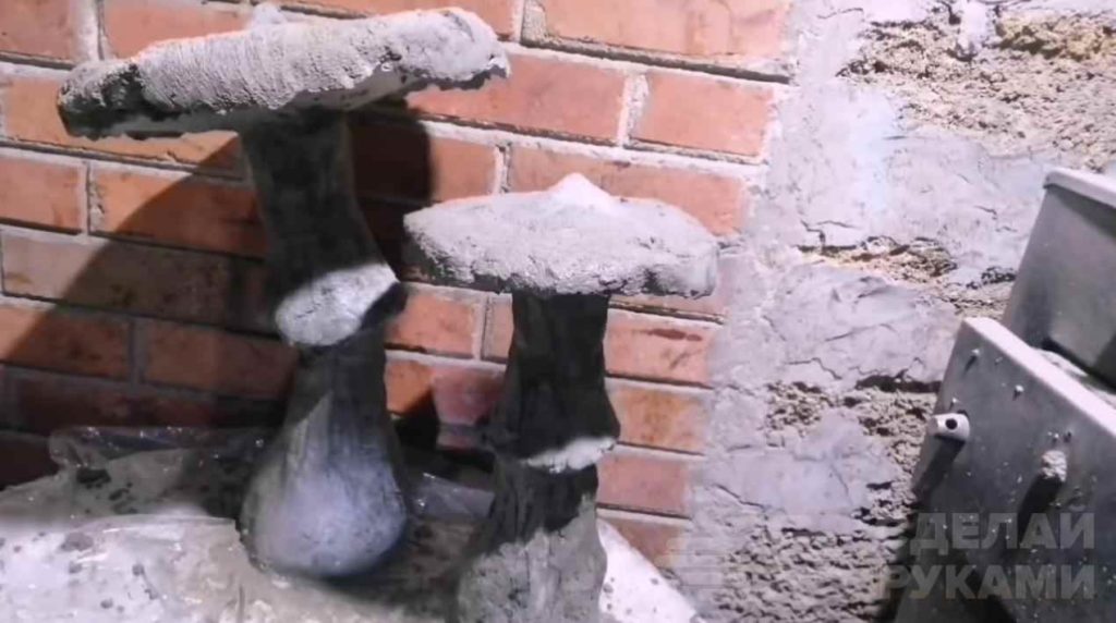 Устанавливаем в формы наши заготовки. С помощью раствора формируем верхнюю часть основания и обмазываем ножку мухомора. Отверстие в трубе закрывать не нужно.