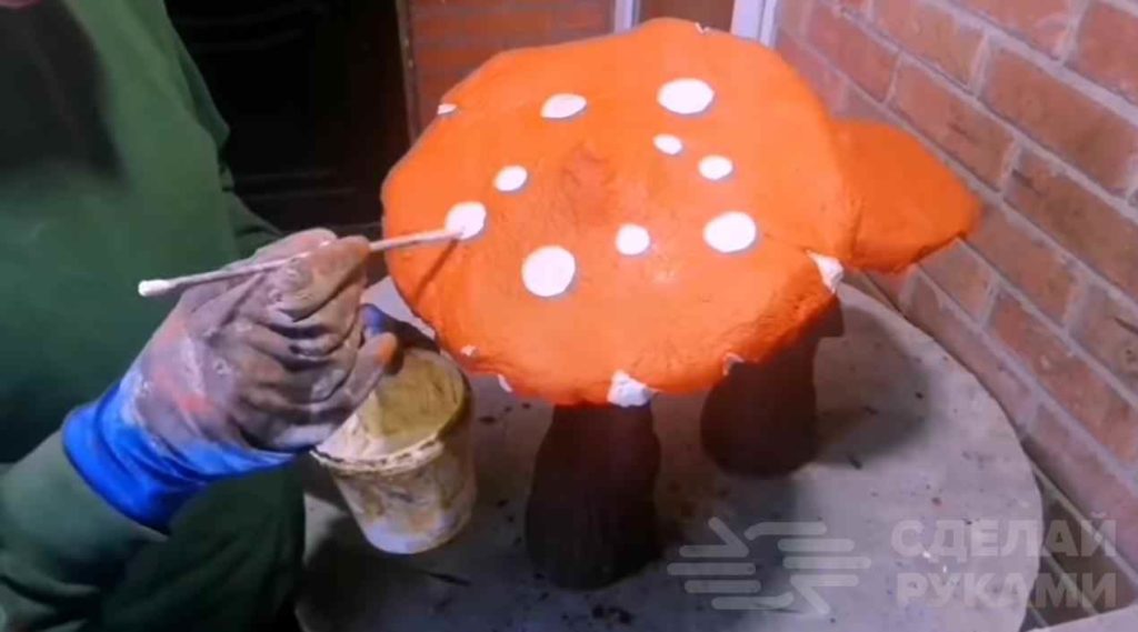 Устанавливаем мухоморы на подставку, смачиваем поверхность водой и обмазываем уже чистовым раствором, придавая изделиям необходимую форму.
