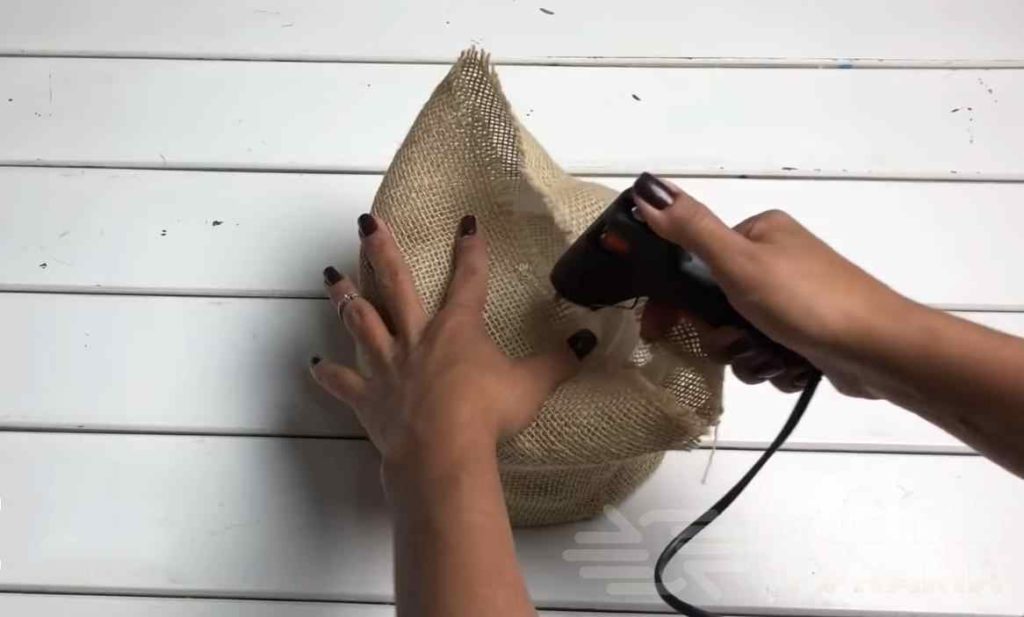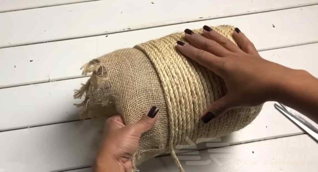Первым делом отрезаем подходящий по размеру кусок джутовой мешковины. После этого оборачиваем ткань вокруг пластиковой емкости и склеиваем края.