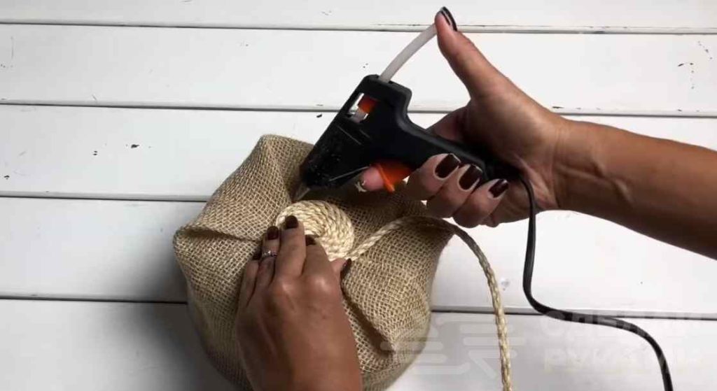 На следующем этапе к нижней части будущего горшка автор приклеивает кружок из сизалевой веревки, а потом укладывает веревку по кругу, фиксируя термоклеем. Таким образом получаем дно горшка.