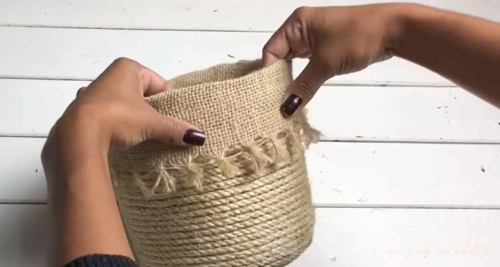 После этого обматываем веревкой саму емкость. Поднимаем контейнер немного выше и снова обматываем. Затем вынимаем пластиковую емкость, а оставшийся край мешковины заворачиваем наружу.