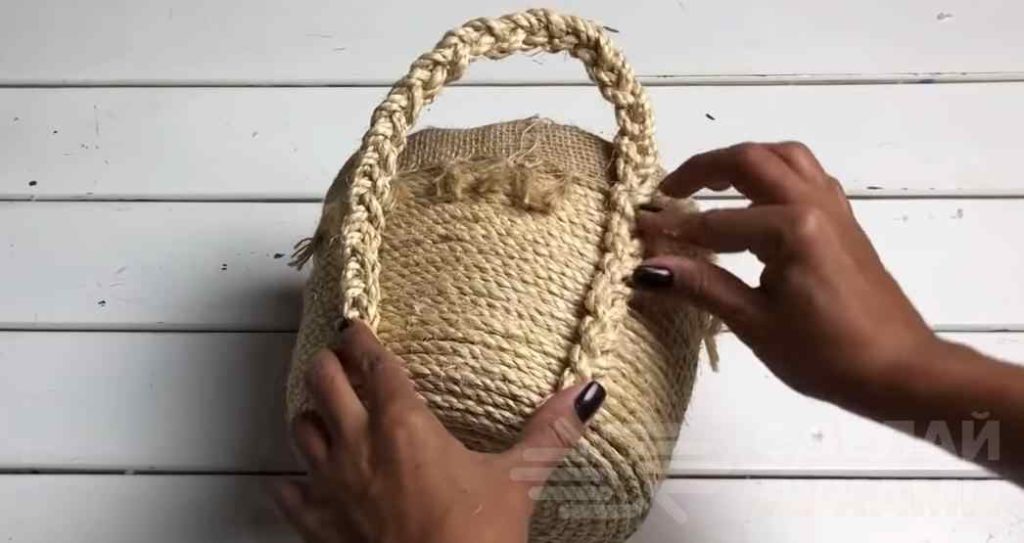Последний штрих — изготовление ручек. Сплетаем веревку в косичку и приклеиваем к горшку. И таким же образом делаем вторую ручку.