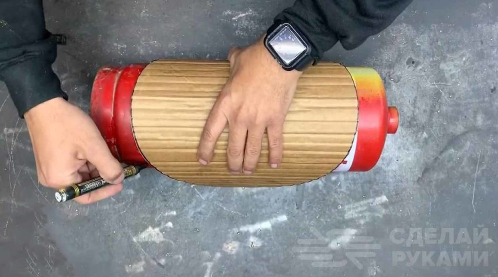 Первым делом автор вырезает шаблон из картона (можно использовать обычный лист бумаги). Используя шаблон, делаем разметку, и при помощи болгарки вырезаем часть стенки огнетушителя.