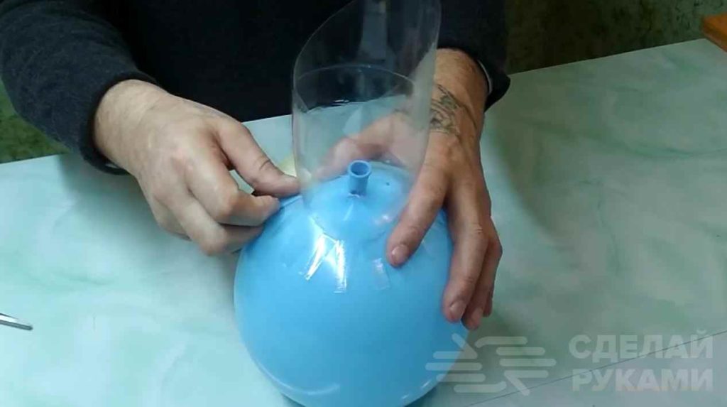 Верхнюю часть бутылки нужно разрезать на полоски одинаковой ширины. Затем с помощью скотча крепим бутылку к надутому до нужного размера шарика.