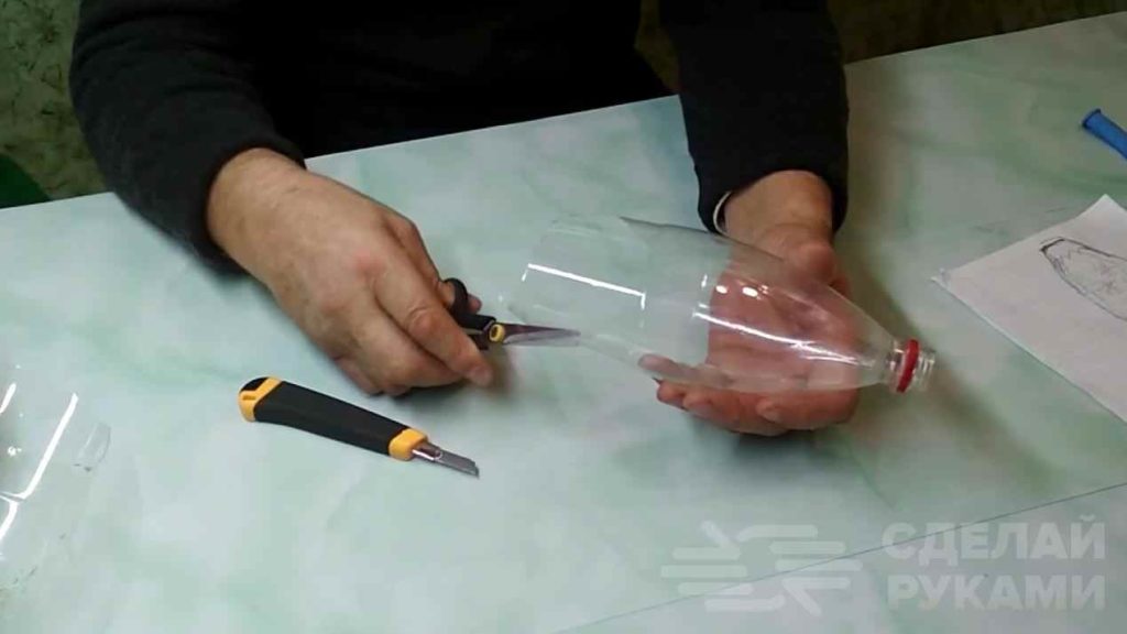 Сначала автор делает разметку на бутылке. Потом отрезаем по разметке нижнюю часть бутылки с дном. Потом отрезаем горлышко.