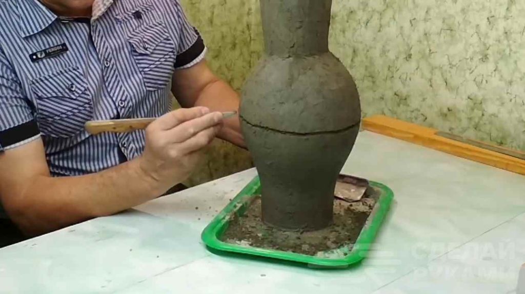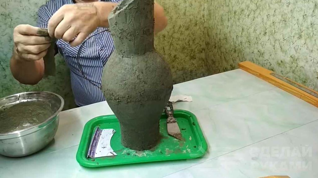 Потом замешиваем уже более густой раствор (из 1 части цемента и 2 частей песка) и обмазываем кувшин, нанося раствор узким шпателем.