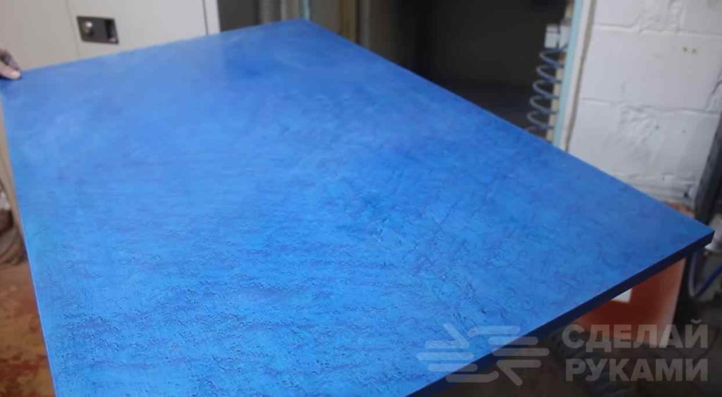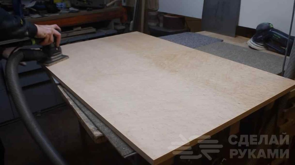 Для начала из листа фанеры вырезаем необходимый размер столешницы. Обрабатываем края наждачной бумагой и убираем все заусенцы с плоскостей. Теперь клеим шпон на верхнюю и нижнюю части столешницы.
