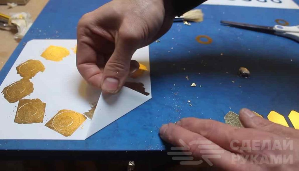 Далее на самоклеящейся бумаге вырезаем необходимый рисунок. Переносим его на столешницу, и заполняем все пустые места сусальной фольгой, разглаживая кистью всю поверхность фольги.