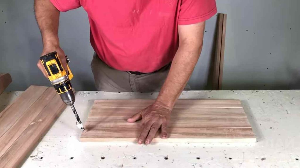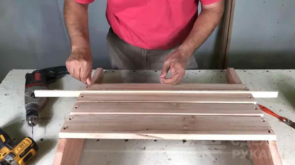 Также необходимо будет подготовить деревянные рейки, из которых будем делать сиденье и спинку. Сверлим в них отверстия.