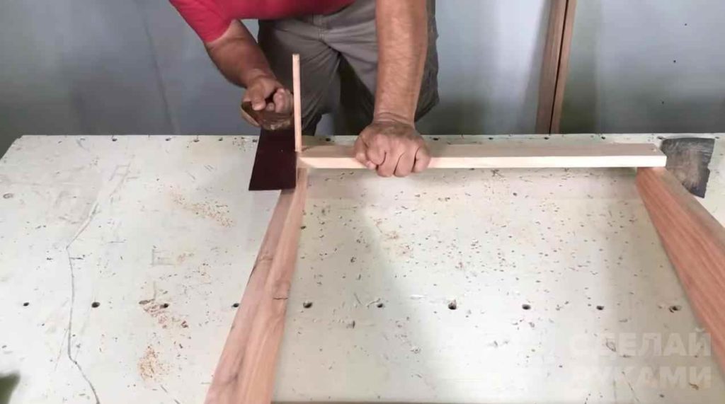 Между планками выдерживаем одинаковый зазор. К нижней части передних ножек автор крепит перемычку для большей жесткости каркаса.