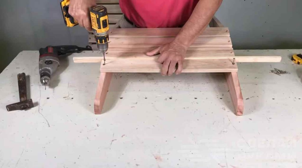На следующем этапе приступаем к изготовлению сиденья. Для этого прикручиваем подготовленные деревянные рейки к передним ножкам.