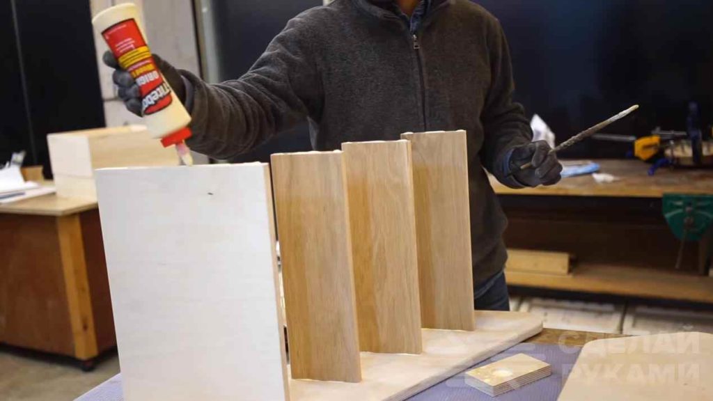 Далее изготавливаем ступени и верхнюю площадку. После этого соединяем все детали вместе. Стягиваем струбцинами и оставляем на некоторое время, пока не высохнет клей.
