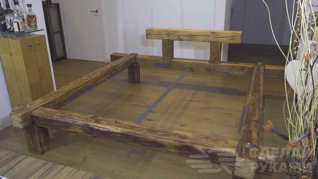 Но такая мебель часто используется в современных интерьерах с деревенским мотивом. Поэтому и наша двуспальная кровать тоже имеет право на существование.Тем более что каркас получится прочным и надежным, и не один год еще прослужит.