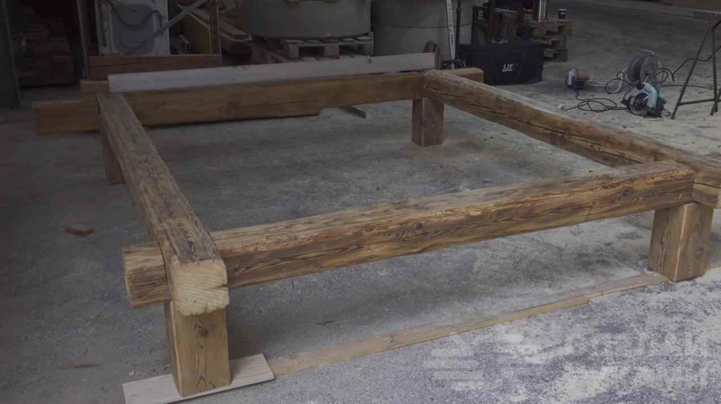 На следующем этапе отпиливаем от деревянной балки четыре заготовки (ножки) и крепим их к нижней части каркаса.