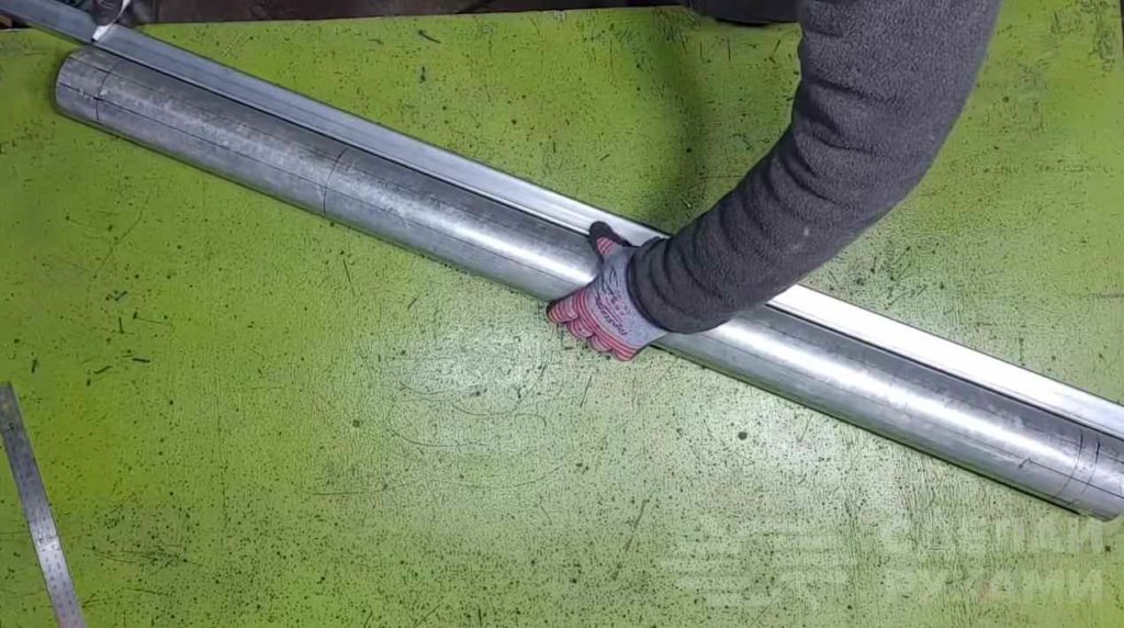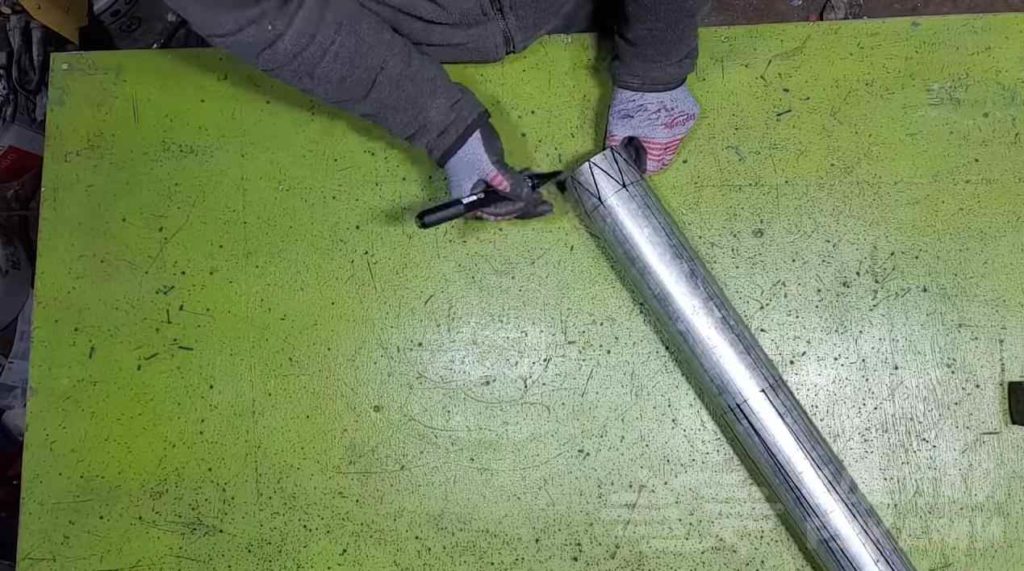 Первым делом автор отрезает подходящий по длине кусок стольной круглой трубы, и делает разметку по всей окружности.