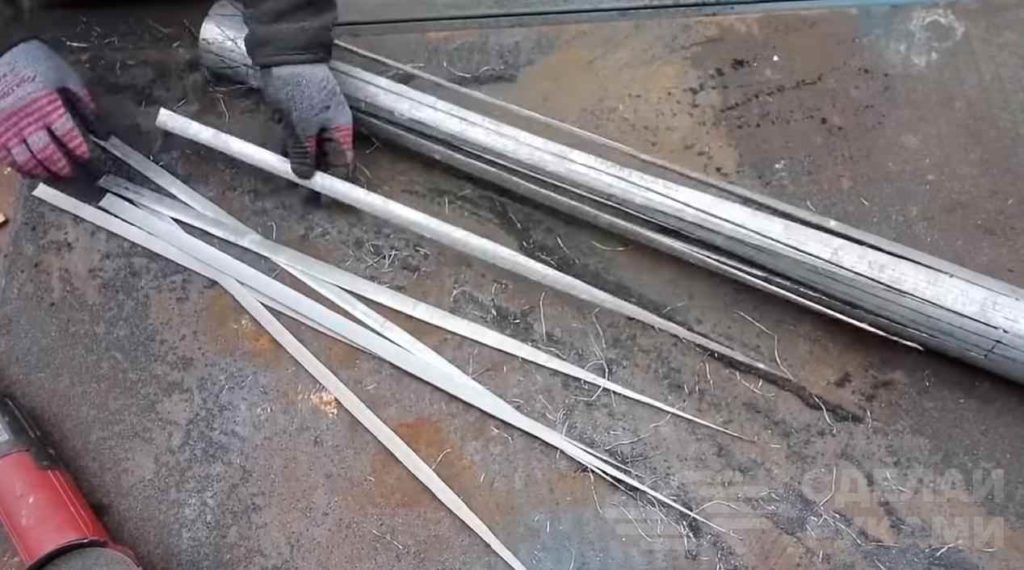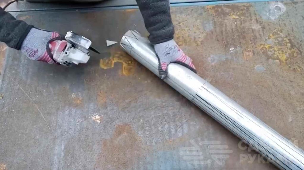 Далее по разметке вырезаем с помощью болгарки лишние куски металла — как в центральной части трубы (примерно до середины), так и по краям.