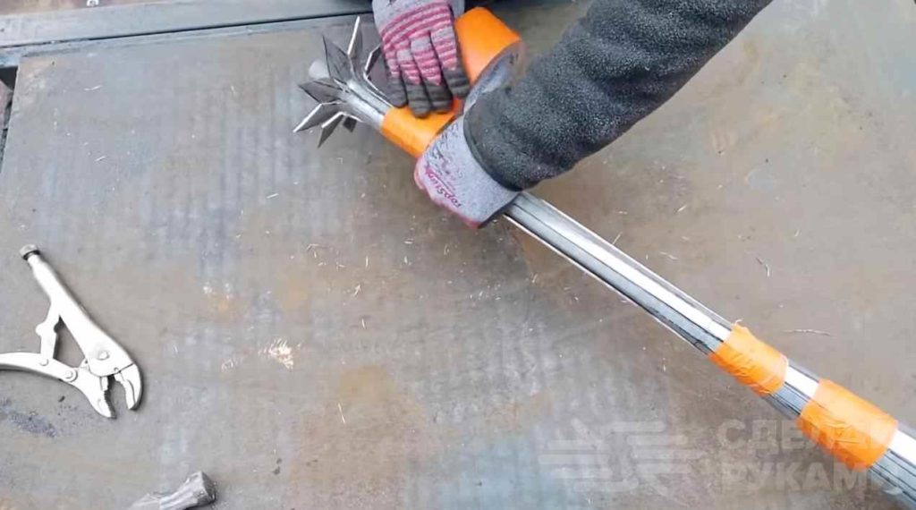 На следующем этапе сжимаем трубу, формируя ручку. Временно фиксируем скотчем. В ручку автор вставляет кусок металлической трубы.
