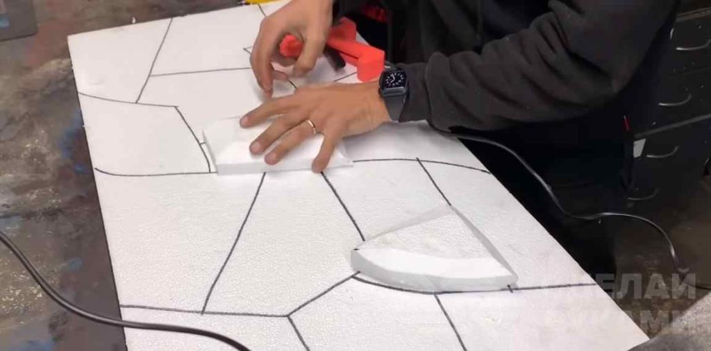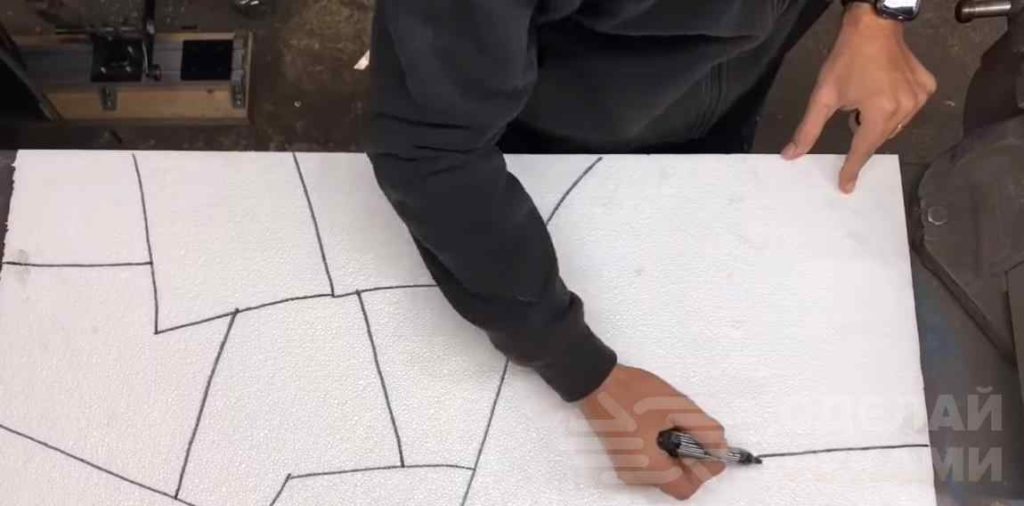 Первым делом отрезаем кусок пенопласта нужного размера или же используем стандартный цельный лист. С помощью маркера рисуем на лицевой поверхности каменную кладку.