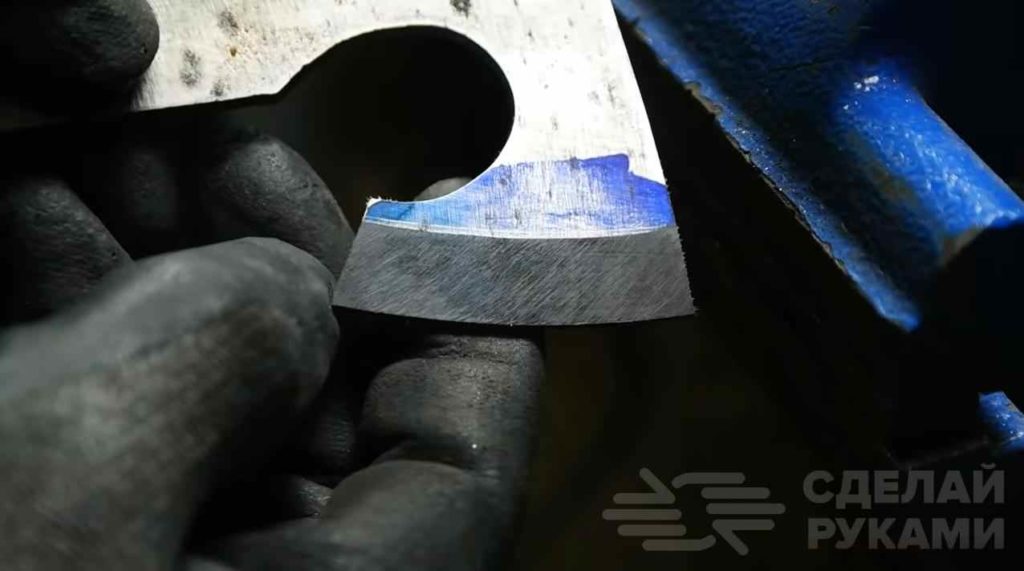 На следующем этапе автор выполняет закалку режущей кромки топора. Затем приступаем к заточке лезвия при помощи наждачной бумаги или точильных брусков.