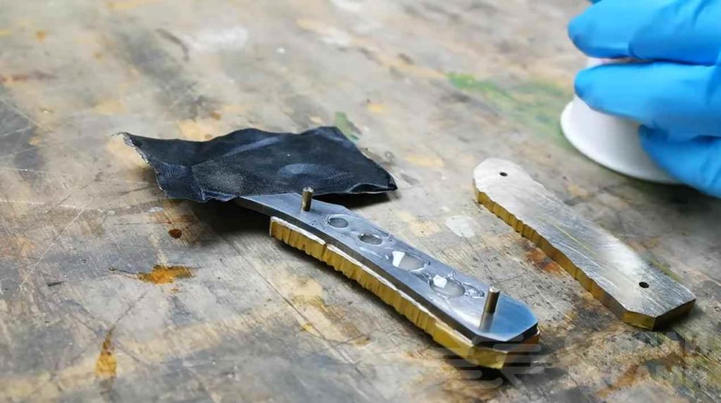Декоративные накладки на ручку автор решил изготовить из латуни. Вырезаем две заготовки нужной формы и крепим к ручке топора. Потом обрабатываем напильником по металлу.