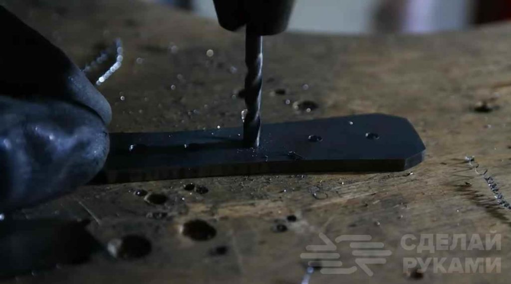 После этого формируем спуски лезвия с двух сторон топорика. В ручке нужно просверлить несколько отверстий.
