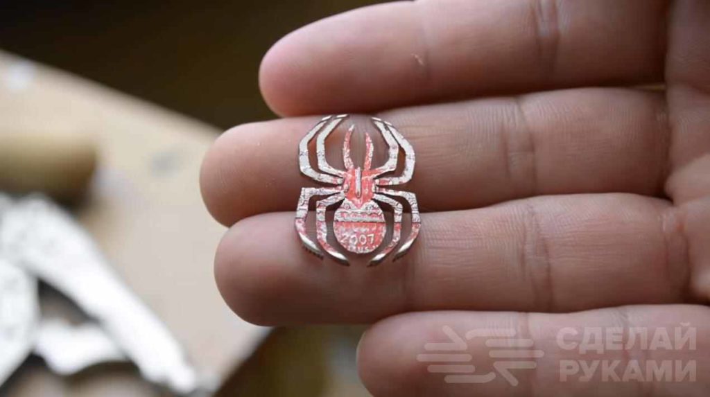 Далее с помощью ручного лобзика вырезаем паука из монеты (или круглой металлической пластины, если монету портить жалко).