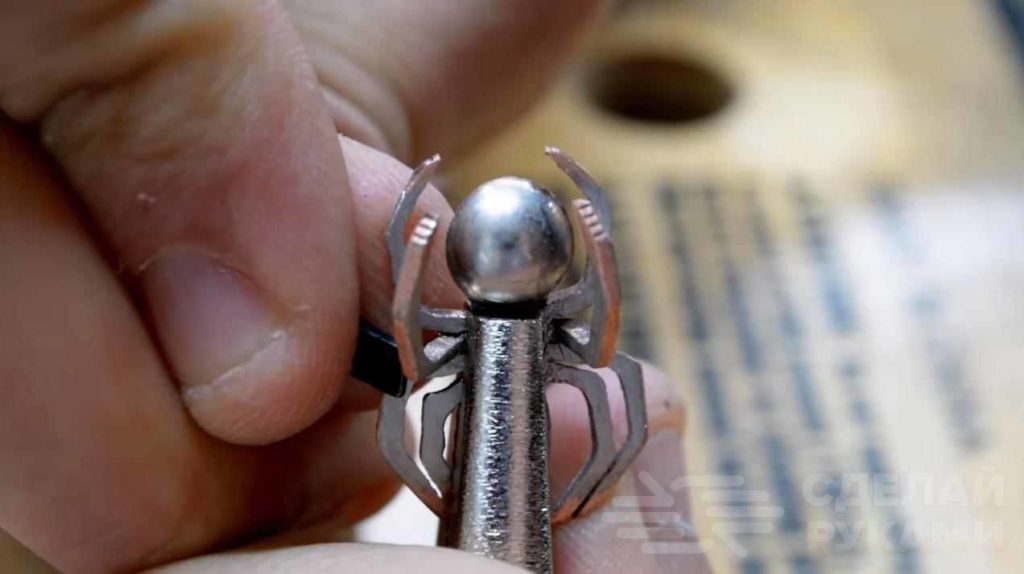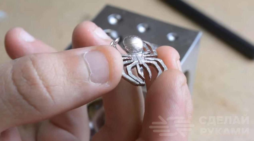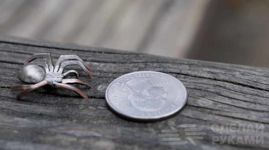 После этого необходимо будет обработать лапки паука, и потом загнуть их круглогубцами. Еще раз все хорошо шлифуем, и поделка готова!