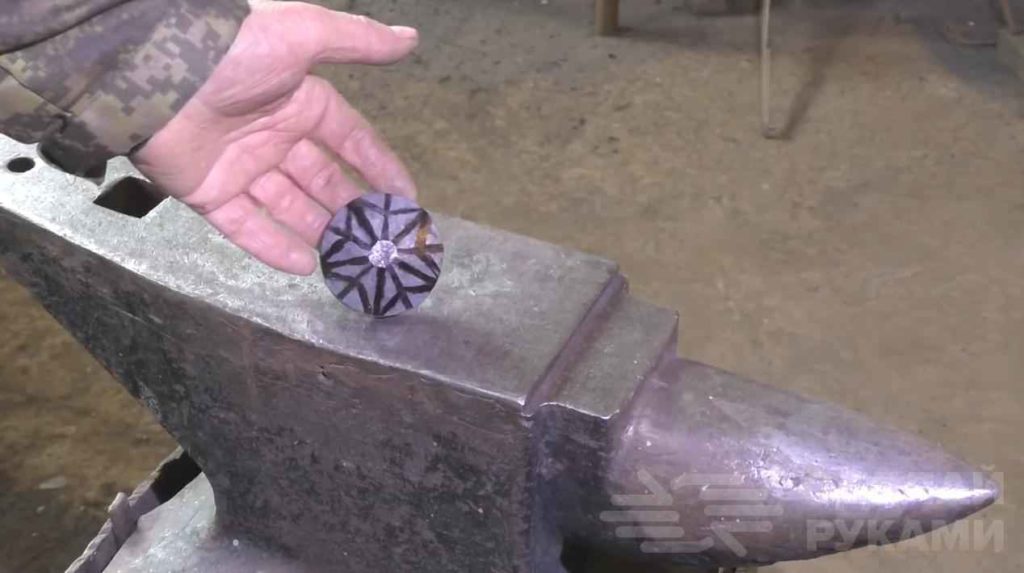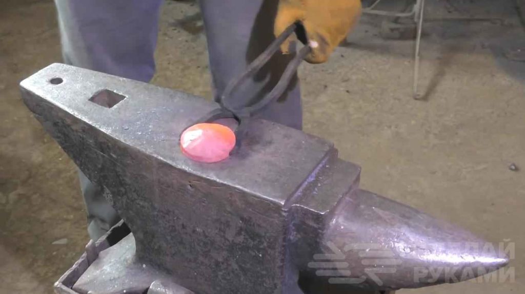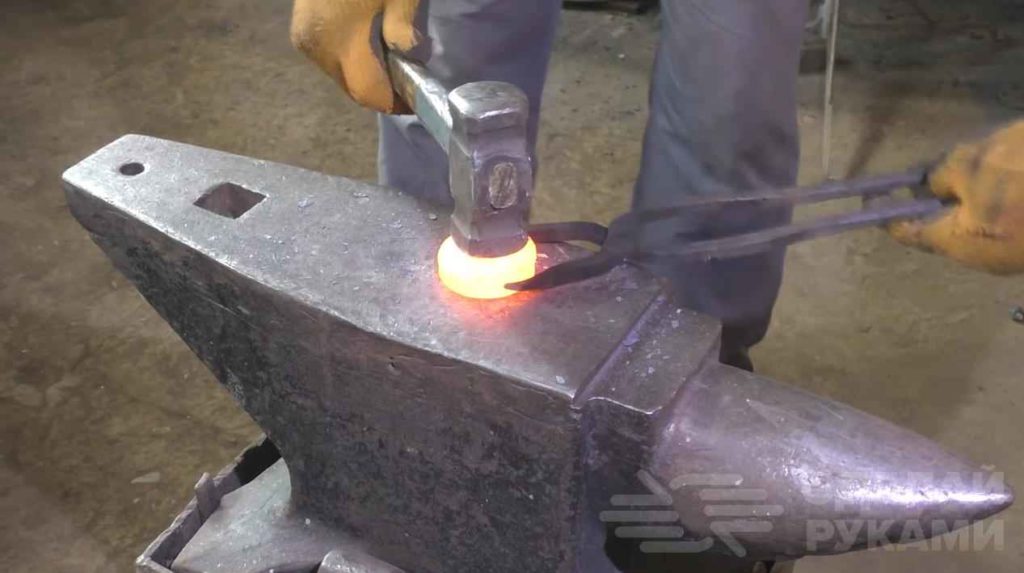 Далее снова нагреваем заготовку в горне и переносим ее на наковальню. С помощью небольшой кувалдочки и исключительно ручной физической силы делаем выпуклой верхнюю часть заготовки. Основание оставляем ровным.
